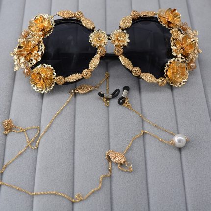 Retro Baroque Flower Crystal Pearl Chain Sunglasses