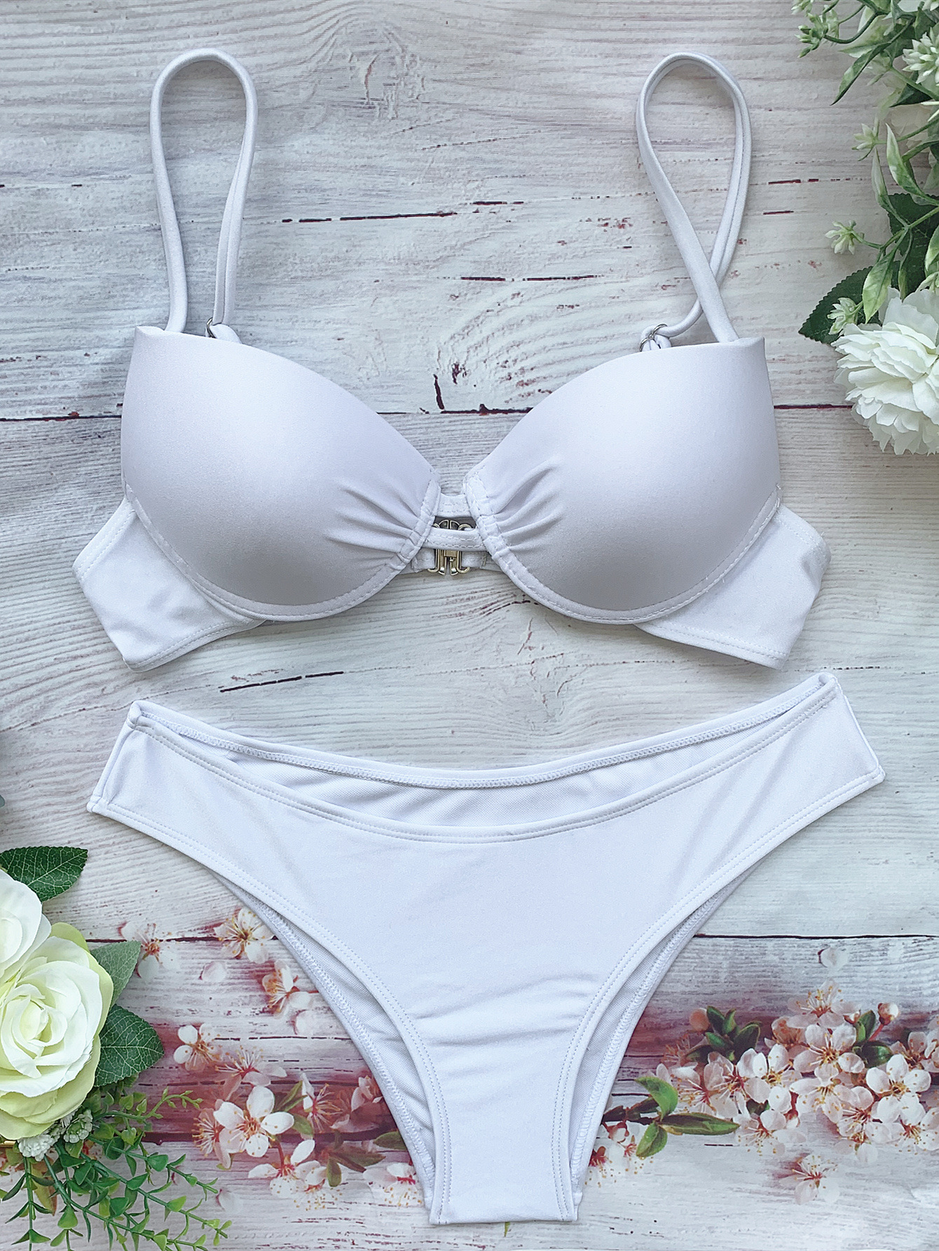 Be the first to review “Women’s New Solid Color Steel Ring Gathered White Two-piece Swimsuit” Cancel reply