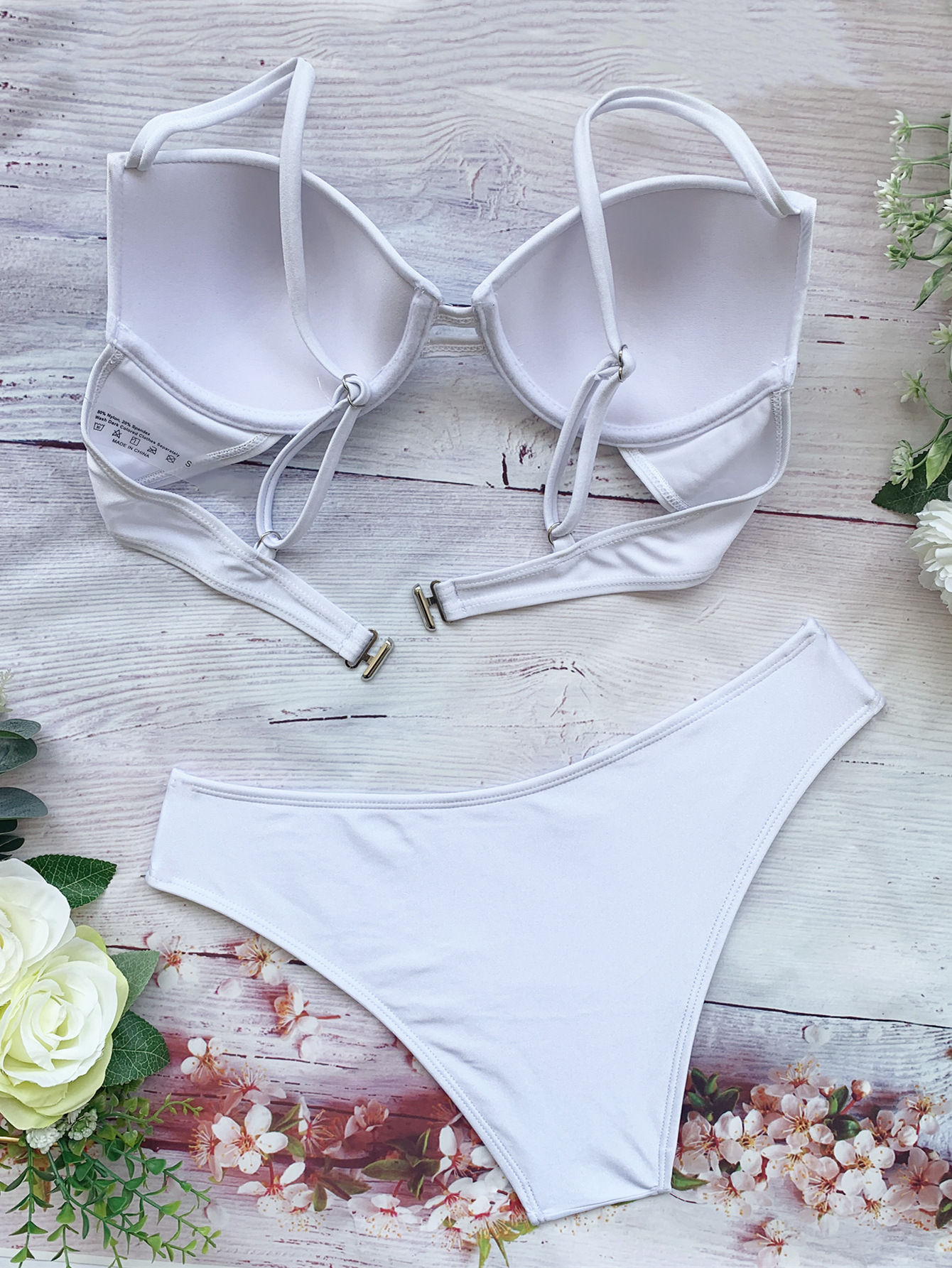 Be the first to review “Women’s New Solid Color Steel Ring Gathered White Two-piece Swimsuit” Cancel reply